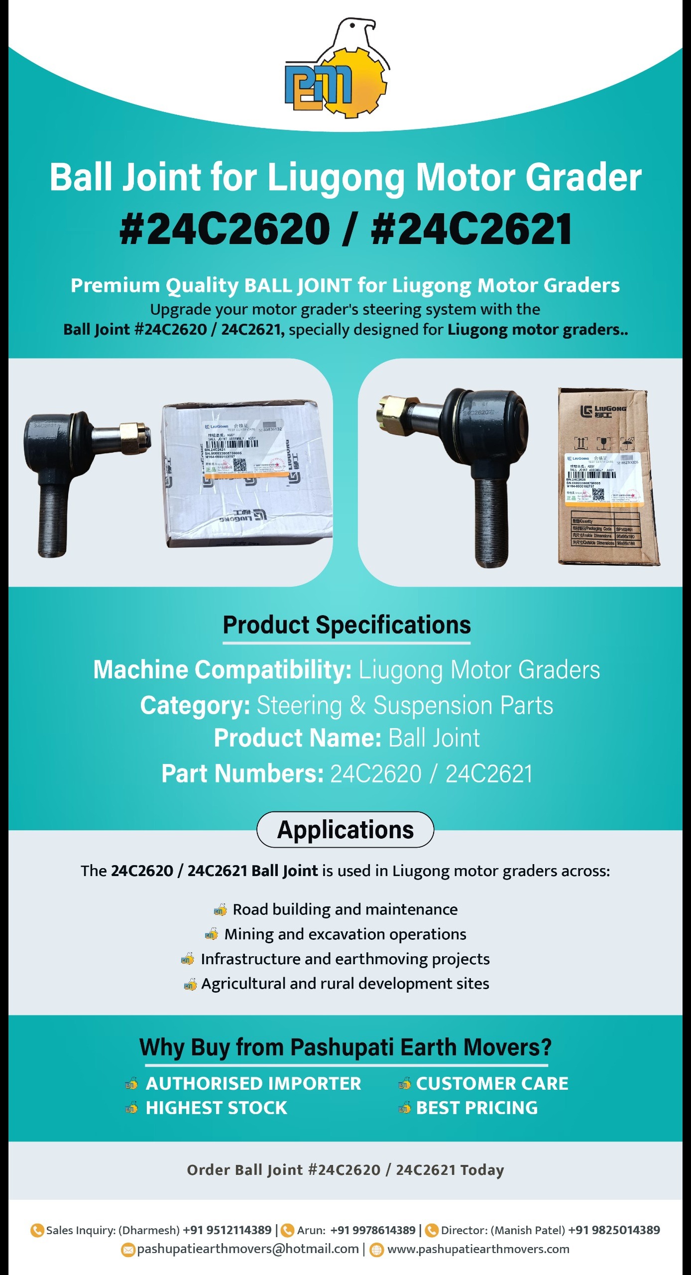Ball Joint for Liugong Motor Grader – #24C2620 / #24C2621 Premium Quality BALL JOINT for Liugong Motor Graders Upgrade your motor grader's steering system with the Ball Joint #24C2620 / 24C2621, specially designed for Liugong motor graders.. Product Specifications: ● Product Name: Ball Joint ● Part Numbers: 24C2620 / 24C2621 ● Machine Compatibility: Liugong Motor Graders ● Category: Steering & Suspension Parts ________________________________________ Applications: The 24C2620 / 24C2621 Ball Joint is used in Liugong motor graders across: ● Road building and maintenance ● Mining and excavation operations ● Infrastructure and earthmoving projects ● Agricultural and rural development sites ________________________________________ Why Buy from Pashupati Earth Movers? ● AUTHORISED IMPORTER ● HIGHEST STOCK ● CUSTOMER CARE ● BEST PRICING ________________________________________ Order Ball Joint #24C2620 / 24C2621 Today