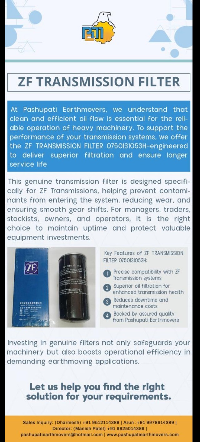 At Pashupati Earthmovers, we understand that clean and efficient oil flow is essential for the reliable operation of heavy machinery. To support the performance of your transmission systems, we offer the ZF TRANSMISSION FILTER 0750131053H—engineered to deliver superior filtration and ensure longer service life.