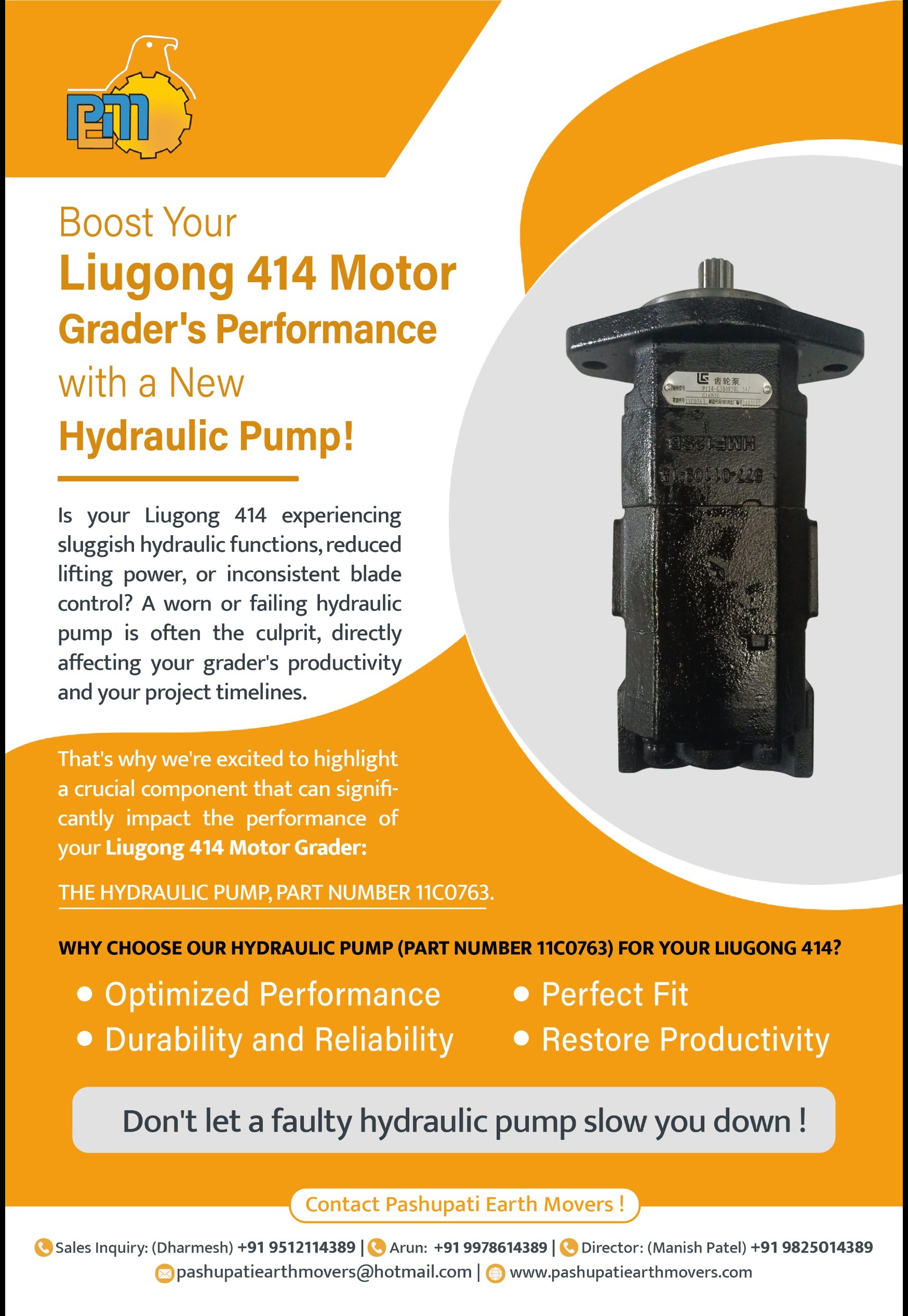 PUMP 11C0763 Is your Liugong 414 experiencing sluggish hydraulic functions, reduced lifting power, or inconsistent blade control? A worn or failing hydraulic pump is often the culprit, directly affecting your grader's productivity and your project timelines. That's why we're excited to highlight a crucial component that can significantly impact the performance of your Liugong 414 Motor Grader: the Hydraulic Pump, Part Number 11C0763. Why Choose Our Hydraulic Pump (Part Number 11C0763) for Your Liugong 414? ● Optimized Performance ● Durability and Reliability ● Perfect Fit ● Restore Productivity Don't let a faulty hydraulic pump slow you down ! Contact Pashupati Earth Movers !